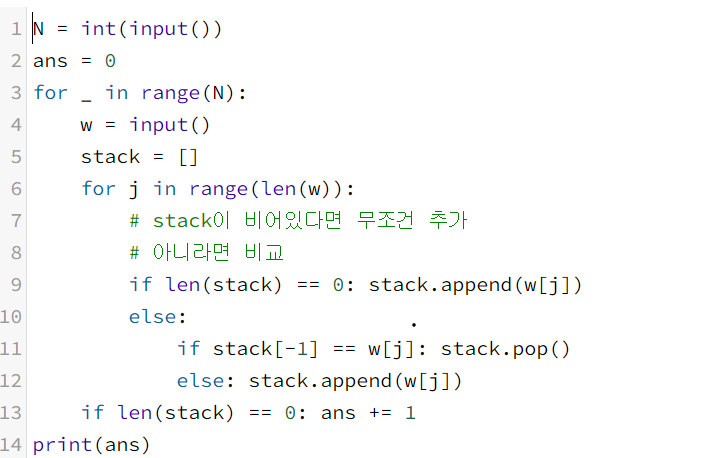 이 문제는 리스트와 pop(),append()를 이용해 풀었다. 문자열을 순회할 때 첫 문자는 무조건 리스트에 넣고, 그 이후는 리스트의 마지막 문자와 비교하여 같으면 pop() 아니면 append() 하여 반복문이 끝났을 때 리스트가 비어있으면 ans+=1 해주었다.