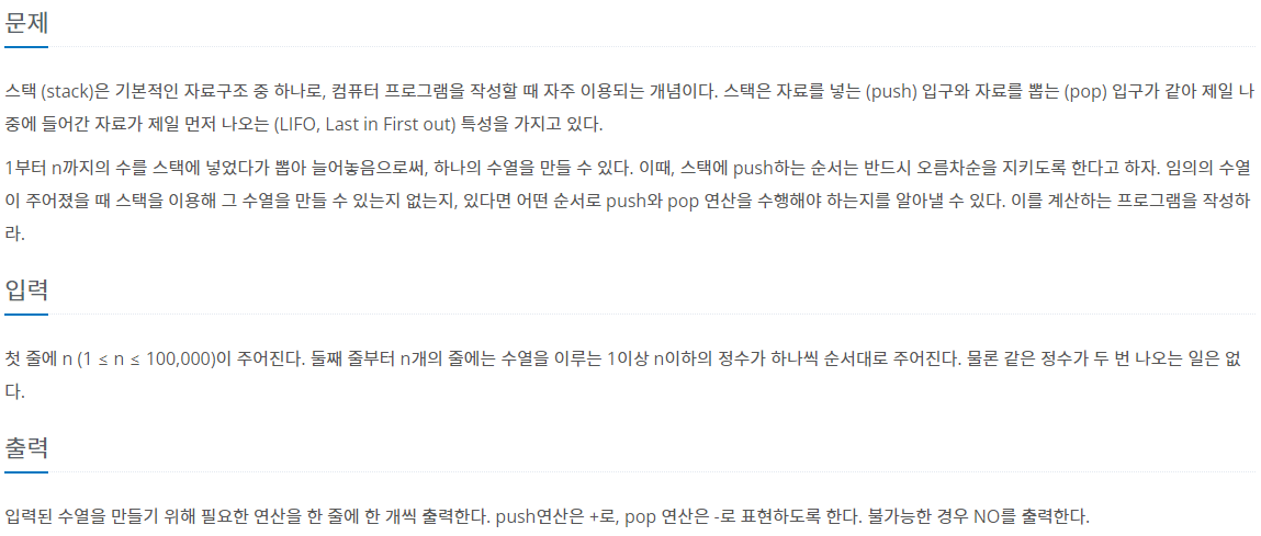 스택 내에서 push와 pop으로 넣었다 뺏다 하면서 그 수열과 같게 만들어야 한다.