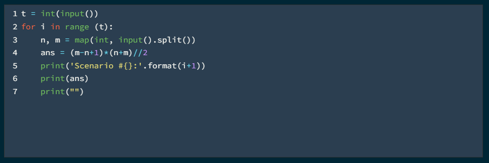 각 테스트 케이스마다 "Scenario #i:"를 출력한 다음, n부터 m까지 모든 정수의 합을 출력한다. 각 테스트 케이스 사이에는 빈 줄을 하나 출력한다.