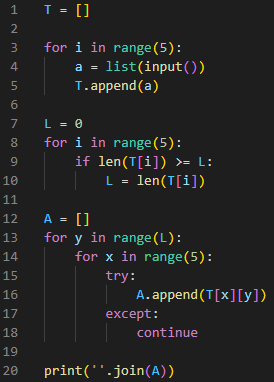 총 다섯줄의 입력이 주어진다. 각 줄에는 최소 1개, 최대 15개의 글자들이 빈칸 없이 연속으로 주어진다. 주어지는 글자는 영어 대문자 ‘A’부터 ‘Z’, 영어 소문자 ‘a’부터 ‘z’, 숫자 ‘0’