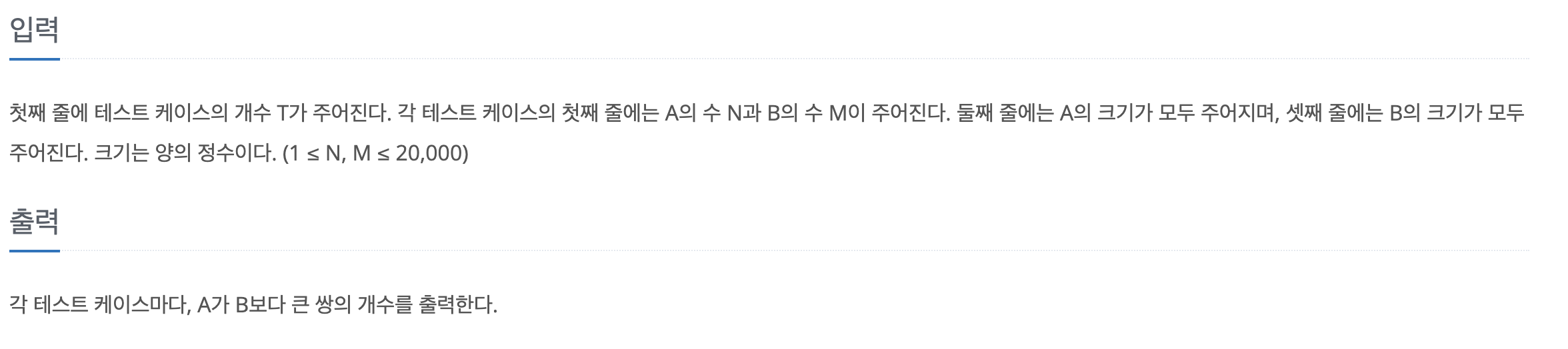 심해에는 두 종류의 생명체 A와 B가 존재한다. A는 B를 먹는다. A는 자기보다 크기가 작은 먹이만 먹을 수 있다. 예를 들어, A의 크기가 {8, 1, 7, 3, 1}이고, B의 크기가 {3, 6, 1}인 경우에 A가 B를 먹을