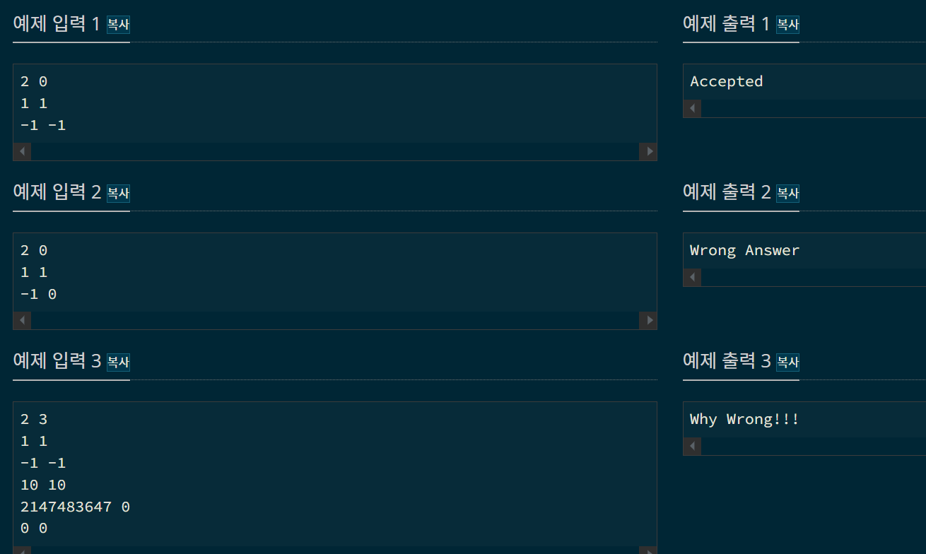 만영이의 코드가 모든 테스트케이스에 대해 올바른 답을 생성했다면 "Accepted"를, 샘플 테스트케이스를 틀렸다면 "Wrong Answer"을, 샘플 테스트케이스는 맞았지만 시스템 테스트케이스를 틀렸을 경우에는 "Why Wrong!!!"을 따옴표 없이 출력한다.