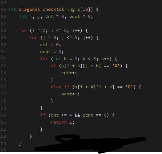 가로줄을 검사하는 함수는 입력받은 바둑판에서, 5개의 바둑돌을 검사하도록 하여 모든 바둑판을 검사하고, 여기서 'X'가 4개 이상이며 'O'가 없다면 1을 반환하게 하여 결과값을 출력할 수 있게 했습니다.