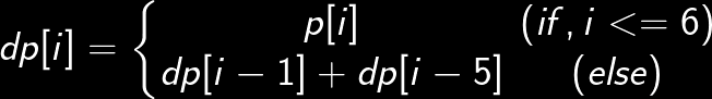 dp[i] = dp[i - 1] + dp[i - 5];