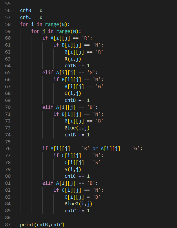 2) 적록색약일 때, 적록색약이 아닌 A 를 먼저 처리 한 후, 함수에 넣기 전에 A 의 'G' 를 모두 'R' 로 바꾼 후 함수 처리함.
