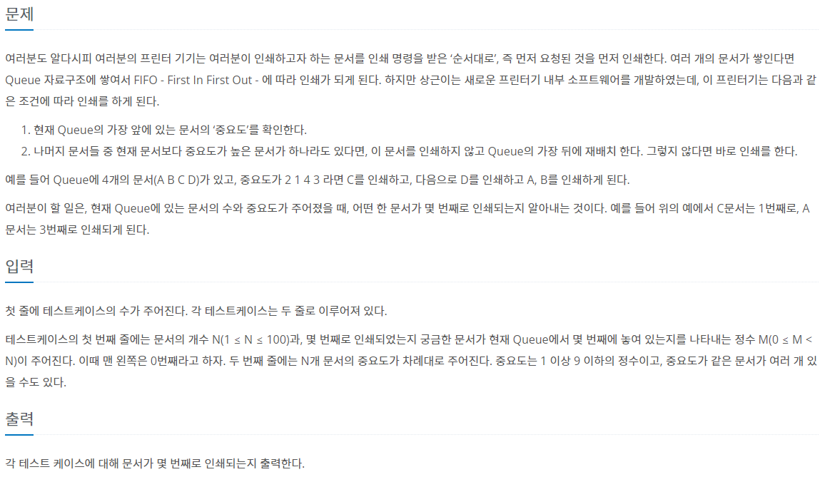 중요도가 높은 순서대로 문서를 인쇄하면서, 특정 문서가 몇 번째로 인쇄됐는 지 출력하는 문제이다.