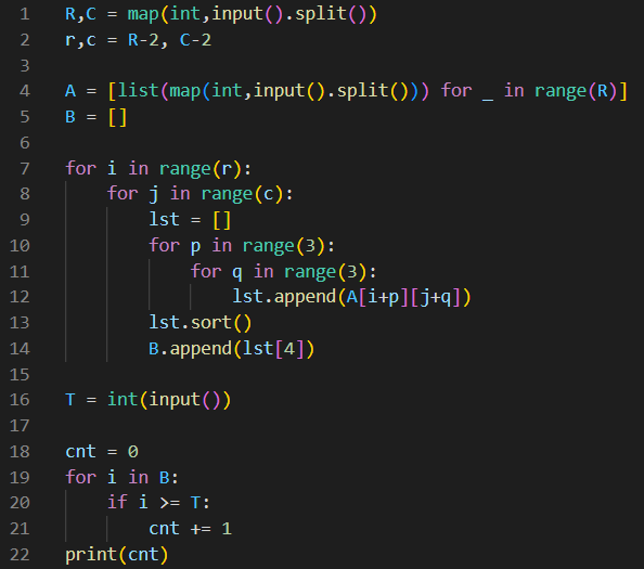 B의 값 중 T 보다 큰 값의 갯수를 구하여 출력.
