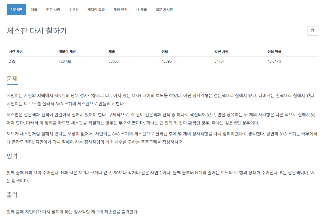 문제 링크 https://www.acmicpc.net/problem/1018 1018번: 체스판 다시 칠하기 첫째 줄에 N과 M이 주어진다. N과 M은 8보다 크거나 같고, 50보다 작거나 같은 자연수이다. 둘째 줄부터 N개의 줄에는 보드의 각 행