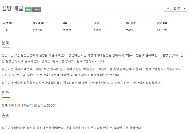 5킬로그램짜리 봉지와 3킬로그램짜리 봉지로 입력받은 숫자(N)만큼의 무게를 배분해서 최소의 봉지로 가져가는 경우를 구하거나, 불가능한 경우 -1을 출력하는 문제였다. 5킬로그램짜리 봉지를 최대한 많이 사용하고 남은만큼 3킬로그램짜리 봉지를 사용하는 경우에 봉지의 수가 최소가 될 것 같아서 이 생각을 갖고 코드를 작성하였다.