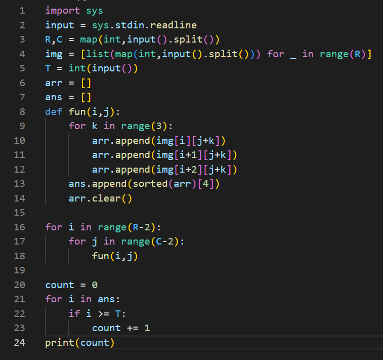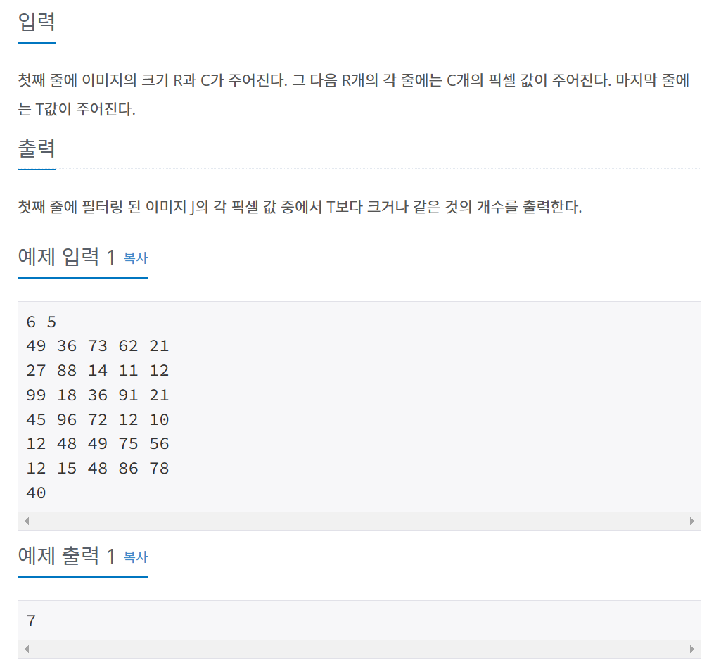 - 필터링된 이미지 ans 내 정수 i가 입력 받은 T보다 크거나 같을 때 count가 1씩 증가
