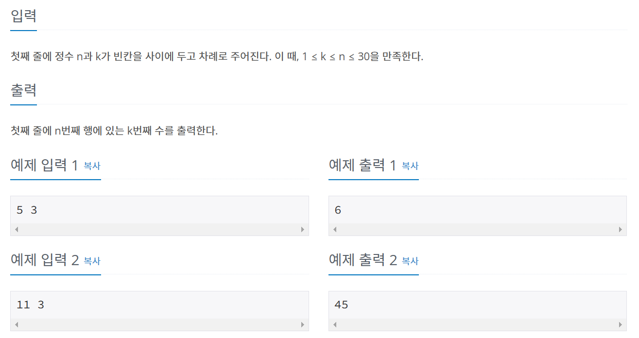 - n번째 행의 k번째 수를 찾기위해 n,k 입력 받음