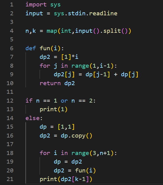 - n이 1 또는 2이면 행에 1만 존재하기 때문에 k의 값과 없이 1 출력