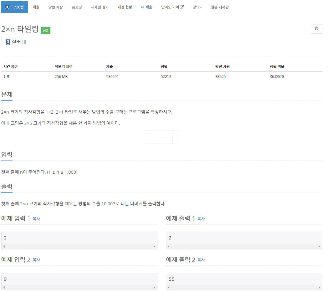 - dp[1]과 dp[2]의 값은 10007보다 작으므로 굳이 나눔처리 하지 않아도 된다.