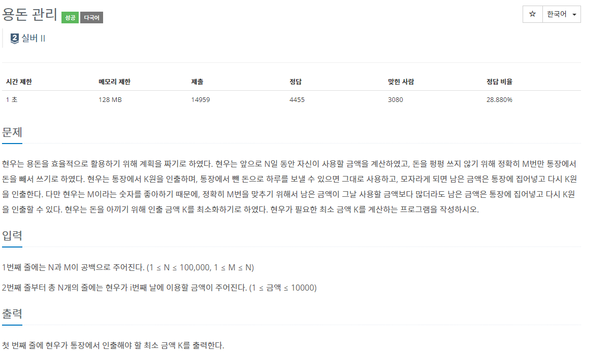 - 최소 금액 K의 범위를 생각해봅시다. K는 각 날짜마다 필요한 금액보다는 크거나 같아야 합니다. 즉, K는 1부터 N * 최대 사용 금액 사이의 값일 수 있다.