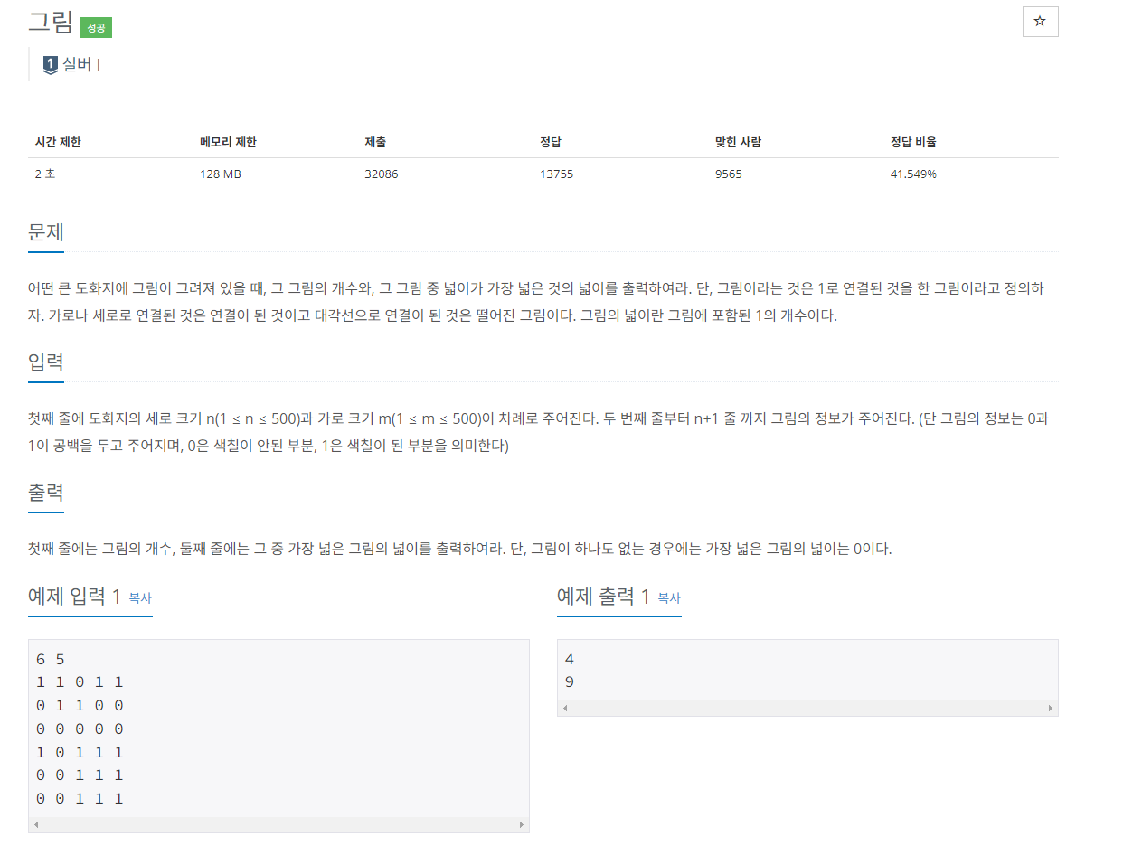 - DFS를 활용하여 그림의 영역을 찾는다. 각각의 1로 이루어진 영역은 하나의 그림을 의미함. 따라서 DFS를 사용하여 연결된 1의 영역을 찾아내고, 각 그림의 넓이를 계산한다.