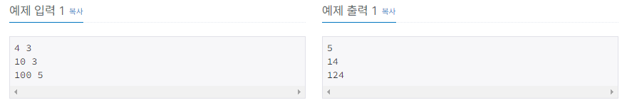 여러 줄에 걸쳐서 자연수 n과 k가 주어진다.