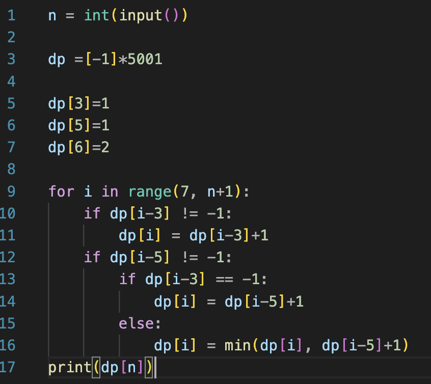 따라서 첫번째 if 문에서는 dp[i-3]의 값을 참고하여 정의하는 경우, 두번째 if문의 첫번째 if문에서는 dp[i-5]의 값을 참고하여 정의하는 경우, 두번째 if문의 두번째 if문에서는 dp[i-3], dp[i-5] 중 작은 값을 골라서 참고하여 정의하는 경우로 조건을 나눌 수 있다.