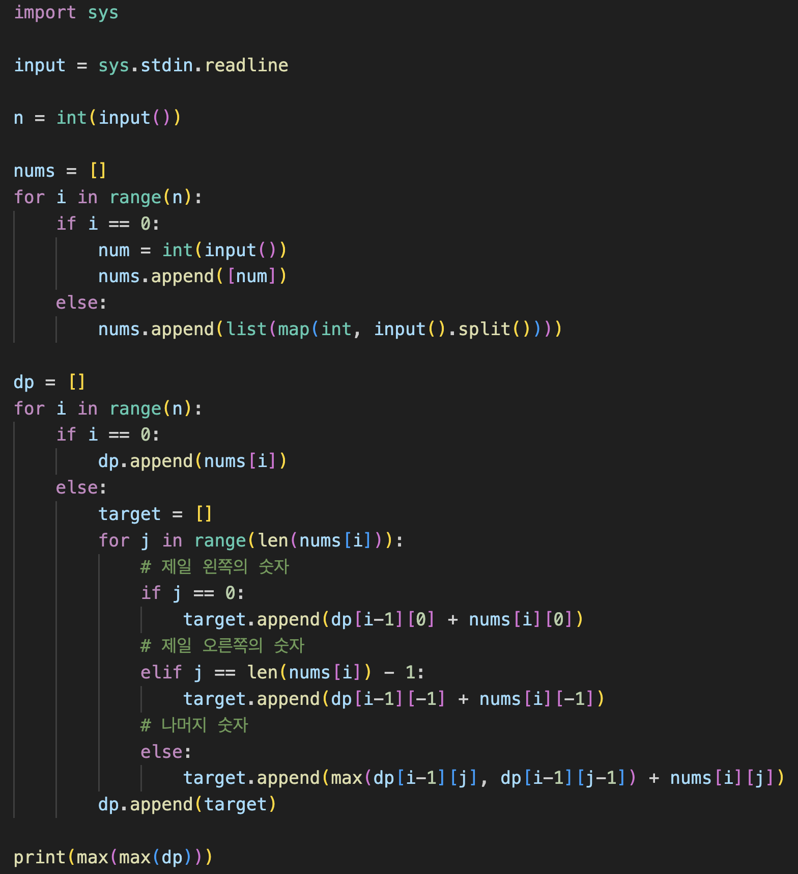 양 끝에 있는 숫자들은 더할 수 있는 값들이 정해져있으므로, 제일 왼쪽과 제일 오른쪽의 숫자들은 이전 값들과 누적된 합들을 합해준다. 그리고 중간에 있는 값들은 dp 내에 있는 현재 idx와 이전 idx 값 중 비교하여 큰 값을 불러와서 출력하도록 한다.