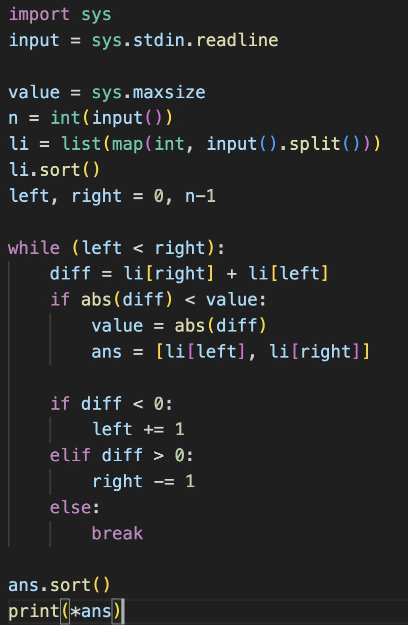 투 포인터 문제이다. 이는 두 숫자들의 합을 이용해서 절대값이 0에 가까운 값을 출력하는 것이다. 만약 절대값이 0이라면 반복문을 그만하고 해당 두 숫자를 출력하면 된다. 그렇지 않다면, 두 수의 합이(절대값 아님) 0보다 작은 음수 값이라면 왼쪽 인덱스 번호를 증가하고, 만약 0보다 큰 양수 값이라면 오른쪽 인덱스 번호를 감소시킨다. 그렇게 최종적으로 절대값이 가장 낮은 값에 해당하는 두 숫자를 오름차순하여 출력해준다.