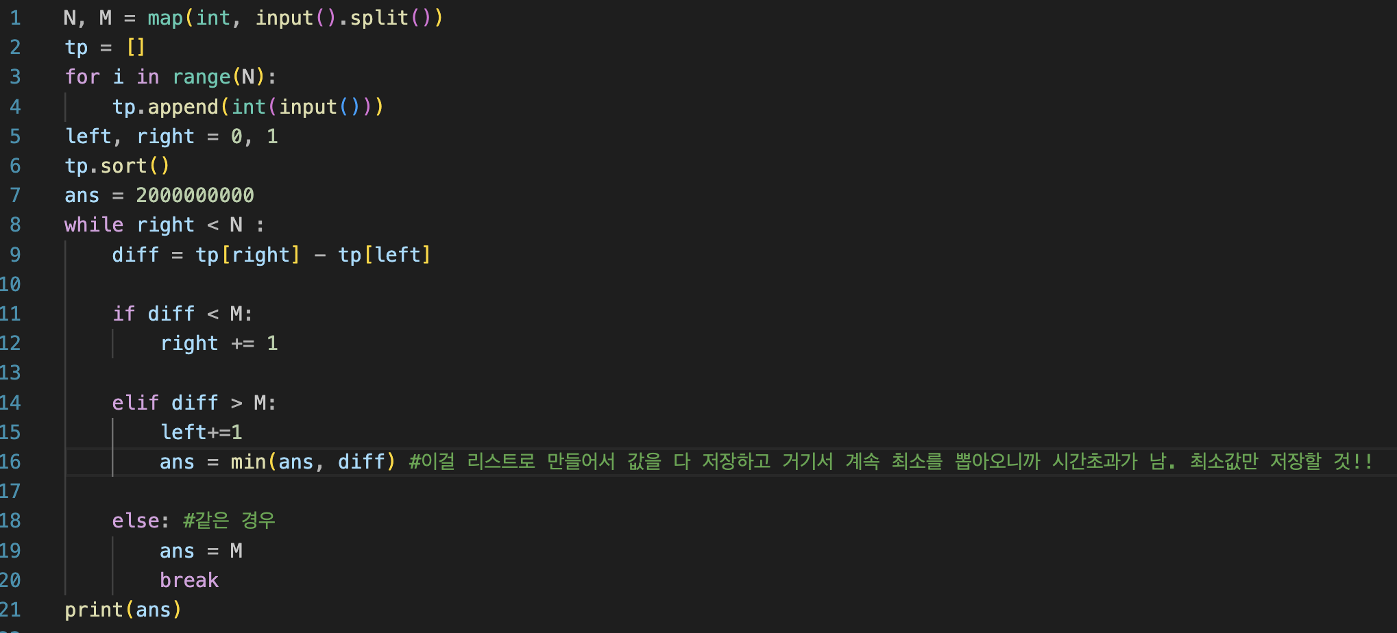 N개의 길이를 가진 수열에서 차가 M이상이면서 가장 작은 경우의 차를 구하는 문제