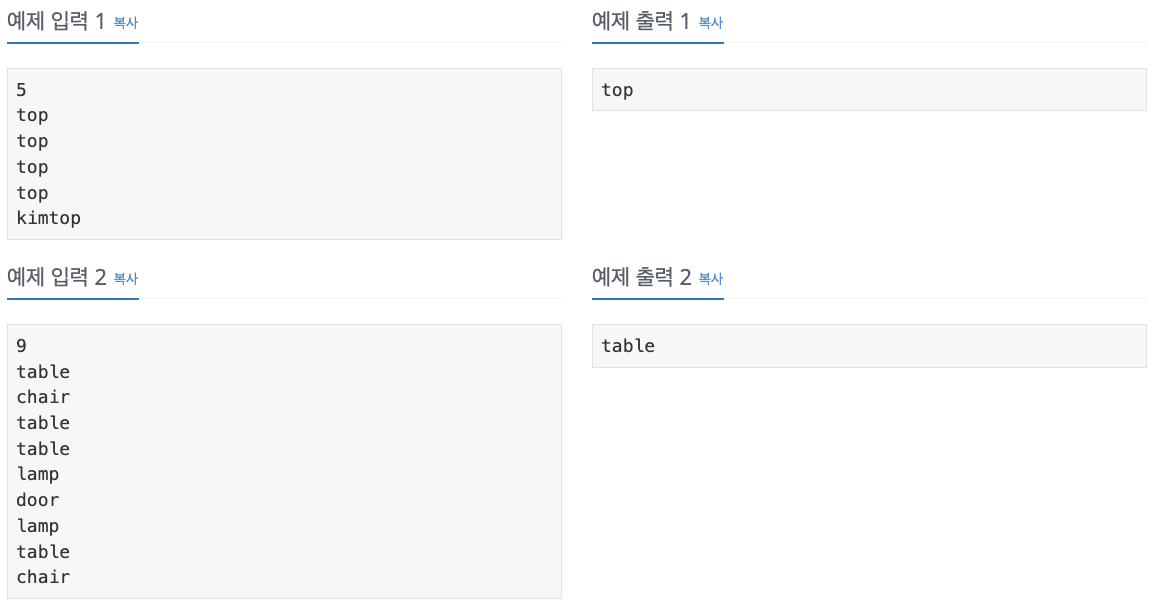 오늘 하루 동안 팔린 책의 제목이 입력으로 들어왔을 때, 가장 많이 팔린 책의 제목을 출력하는 프로그램을 작성하시오.
