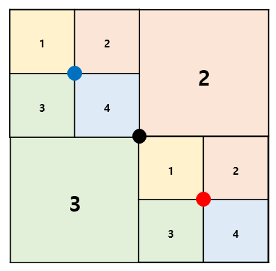 그럼 다시 그 좌표를 기준으로 대각선에 있는 두 부분에서 좌표 하나를 선정해준다. 위 사진 기준으로 파란 점 4와 빨간 점 1이 같다면 가능한 경우일 것이다. 점 3개를 모두 for문을 통해 반복한다면 O(N^6)이라 시간 초과가 발생하지만 우리는 이것을 O(N^4)까지 줄일 수 있다. MITM 알고리즘과 살짝 비슷한데, 두 점에 대해 모두 반복을 돌리는 것이 아닌, 한 점에 대해 모든 결과를 구해놓고 O(N^2), 다른 한 점에 대해 구한 결과에 매칭시켜본다 O(N^2) N^2+N^2므로 O(N^2)이다. 2,3 번 면에도 동일하게 수행해준다.