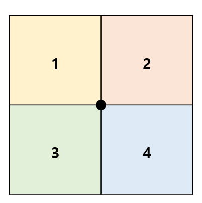 임의의 한 점을 기준으로 분할 해준 뒤 점을 기준으로 대각선에 있는 부분의 합이 같으면 된다.