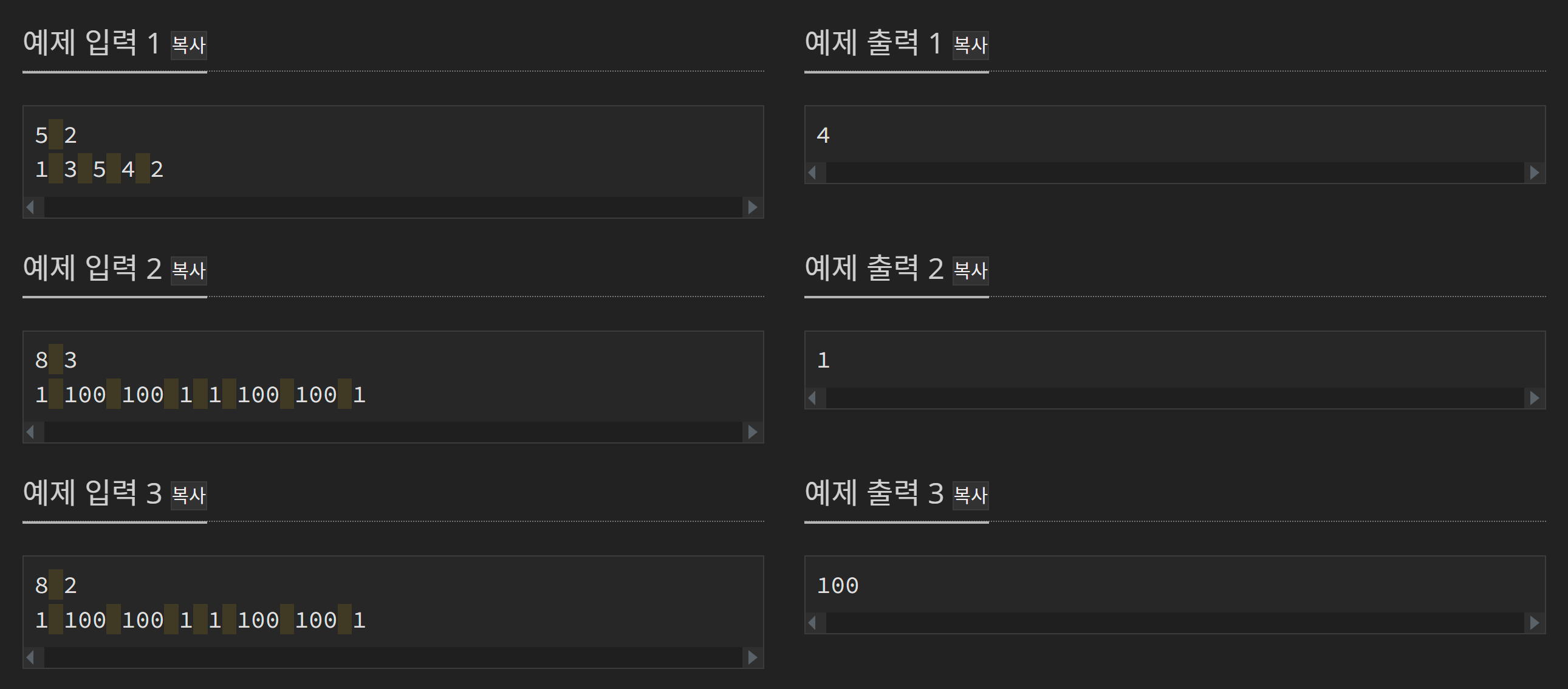 첫 번째 줄에 정수 $N$, $K$가 주어진다. ($1 \le K < N \le 100\,000$) 두 번째 줄부터 $N$개의 기업 의뢰의 비용이 주어진다. 비용은 $1$ 이상 $10^9$ 이하의 정수이다.