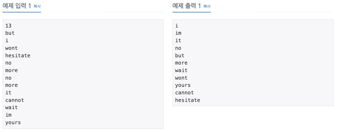 첫째 줄에 단어의 개수 N이 주어진다. (1 ≤ N ≤ 20,000) 둘째 줄부터 N개의 줄에 걸쳐 알파벳 소문자로 이루어진 단어가 한 줄에 하나씩 주어진다. 주어지는 문자열의 길이는 50을 넘지 않는다.