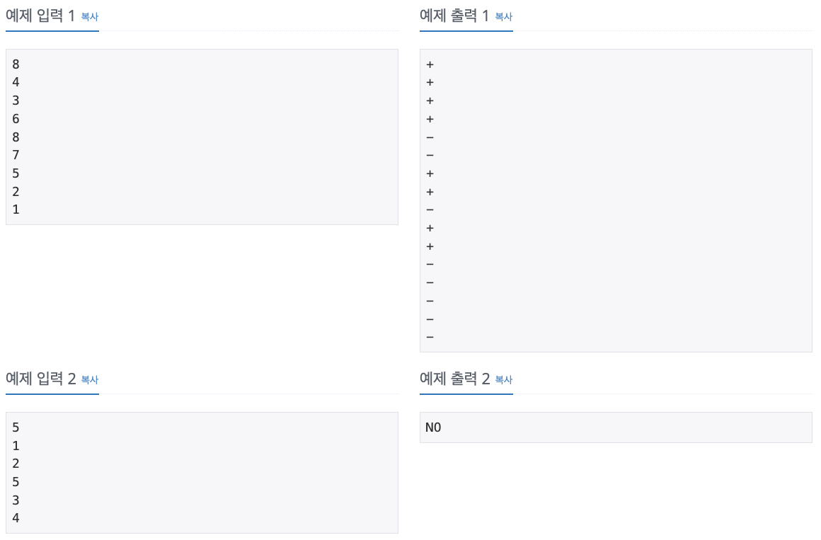 입력된 수열을 만들기 위해 필요한 연산을 한 줄에 한 개씩 출력한다. push연산은 +로, pop 연산은 -로 표현하도록 한다. 불가능한 경우 NO를 출력한다.