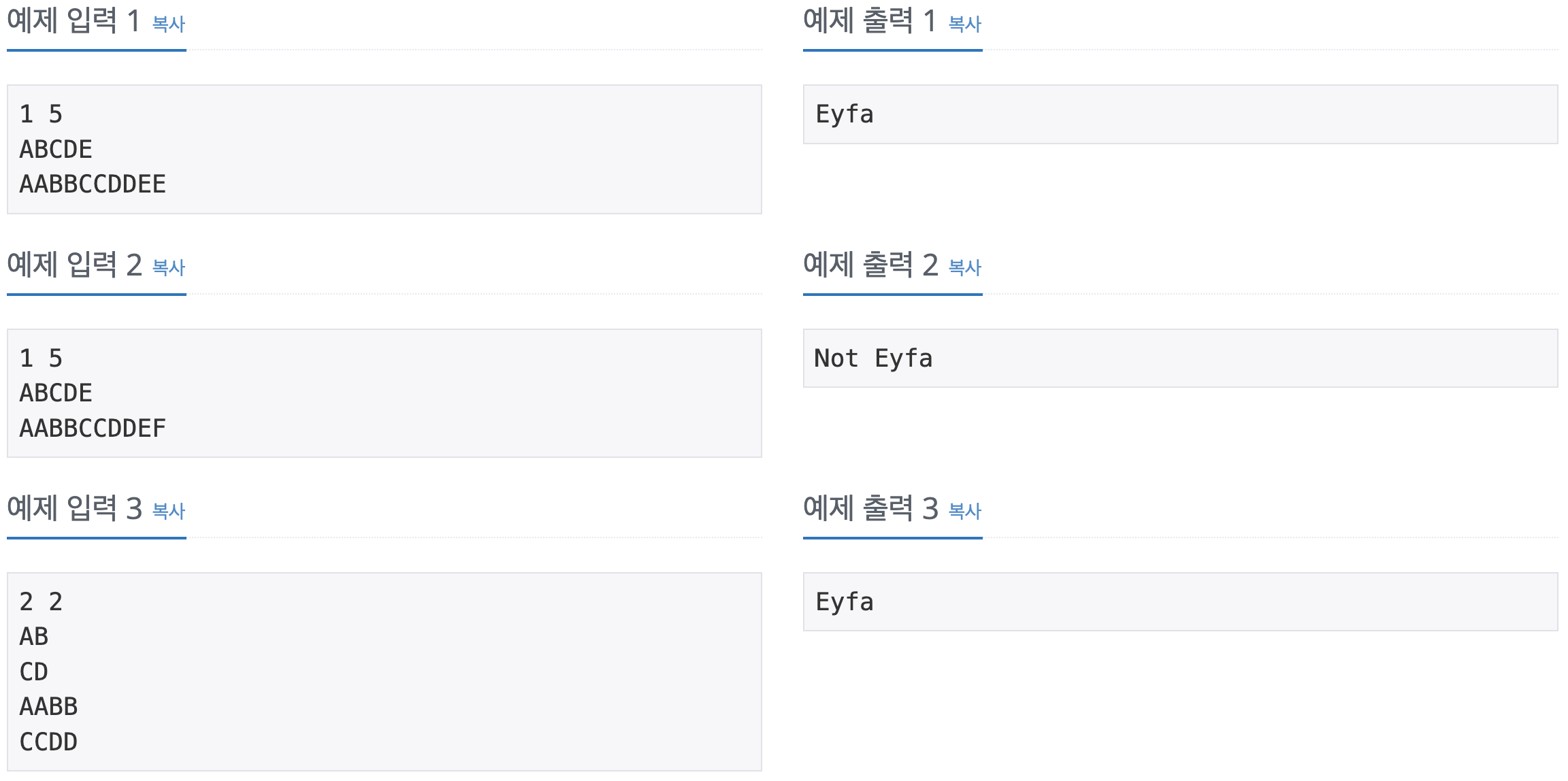 첫 번째로 주어진 이미지를 가로로 두 배로 늘렸을 때 두 번째 이미지가 된다면 "Eyfa"을 출력하고, 되지 않는다면 "Not Eyfa"을 출력한다.