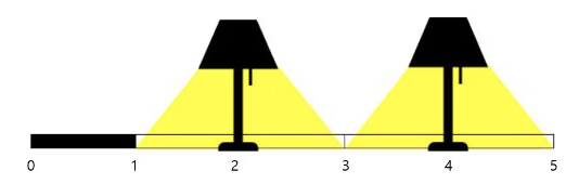 가로등의 높이가 H라면 왼쪽으로 H, 오른쪽으로 H만큼 주위를 비춘다.