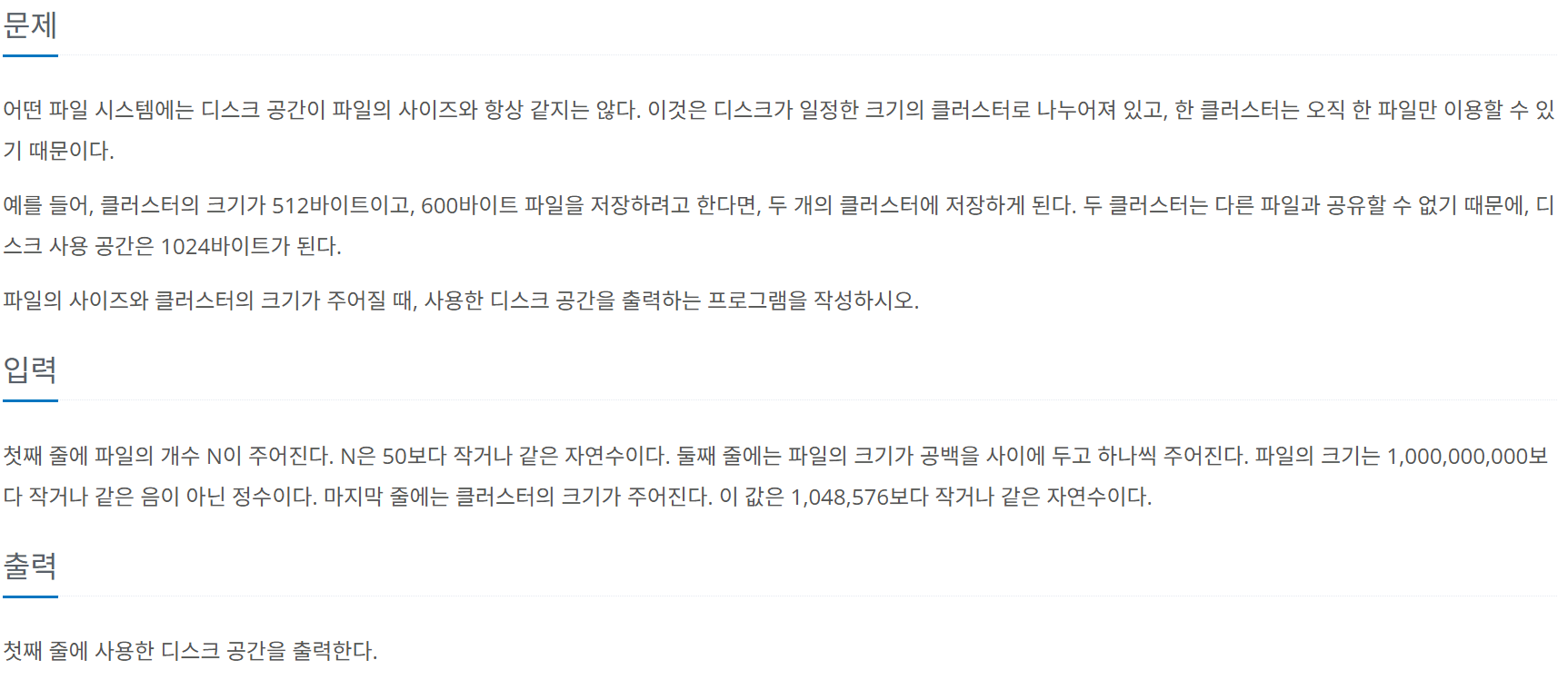 3. 각 파일의 크기를 클러스터의 크기로 나눈다. 이때 나머지가 없을 경우 해당 몫을 count에 더하고, 나머지가 있을 경우 (몫 + 1)을 count에 더한다.