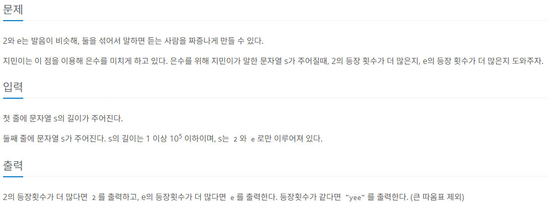 7. 모든 반복을 끝낸 후 2의 등장횟수와 e의 등장횟수를 비교하여 경우에 맞는 출력값 출력