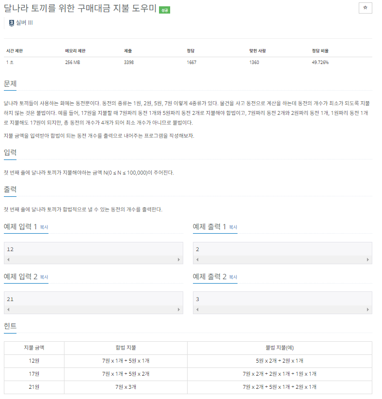 토끼는 1,2,5,7원의 동전을 가지고 최소의 개수로 해당 가격을 딱 맞추어서 내야한다.