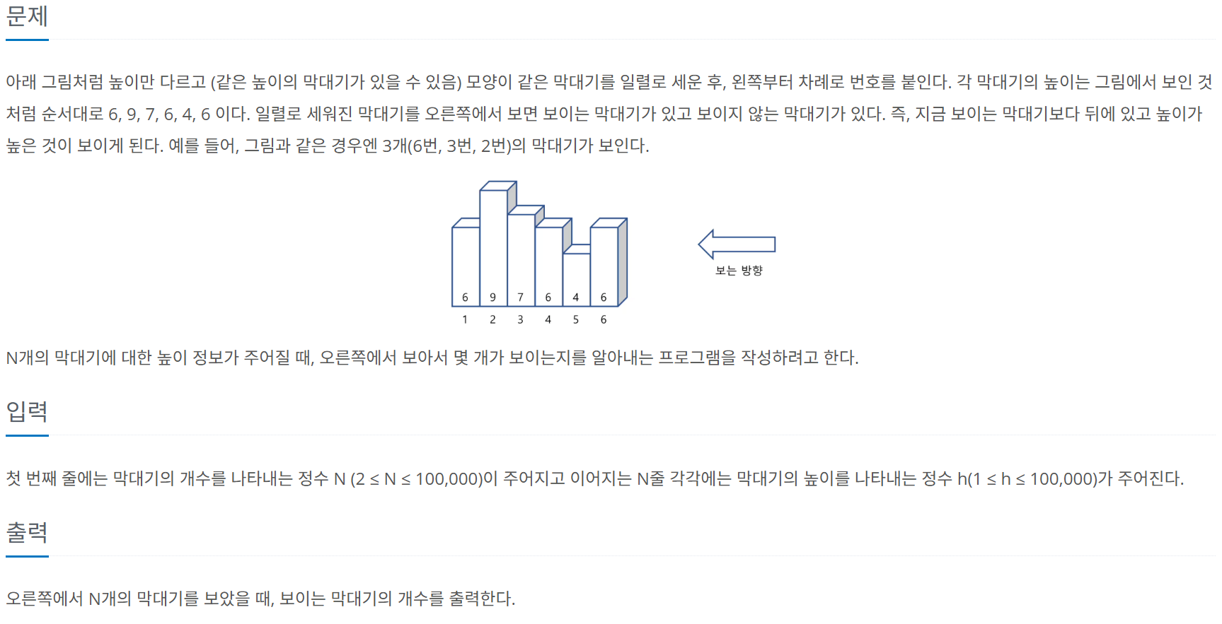 2. 오른쪽에서 왼쪽으로 막대기를 탐색하며 지금까지 탐색한 막대기 중 가장 큰 것과 비교한다. (max값 구하는 알고리즘과 유사)