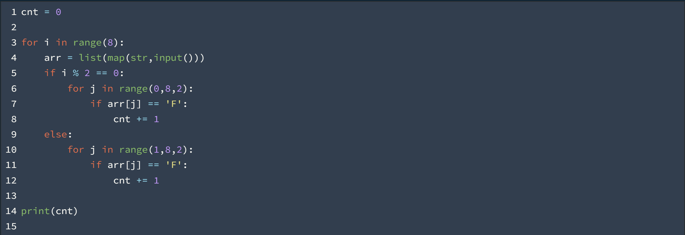 3. 해당하는 칸의 문자가 'F' 이면 cnt를 증가시킨다