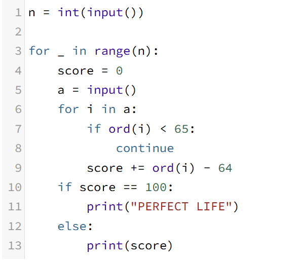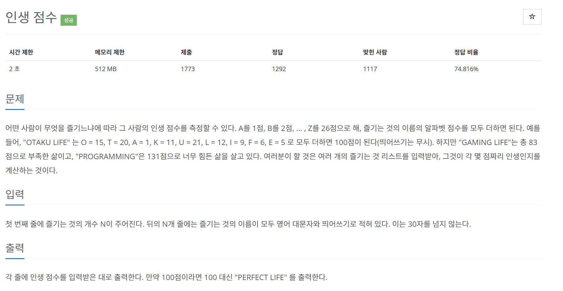 문자열을 입력받고 아스키 코드로 점수의 합을 구한다.