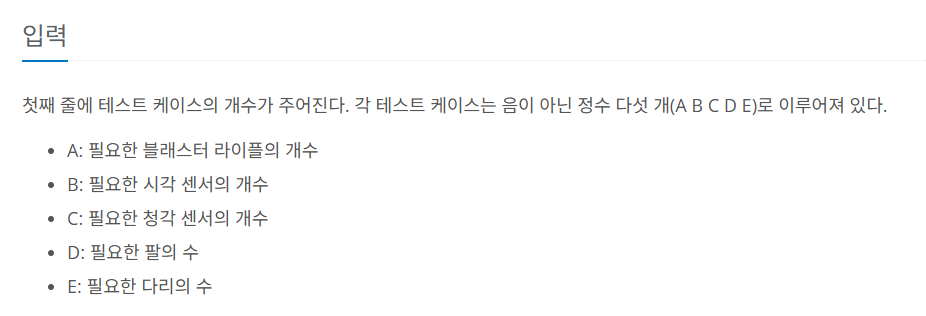 1. 각 테스트 케이스마다 필요한 부품의 수를 split을 통해 한 줄로 입력받는다.