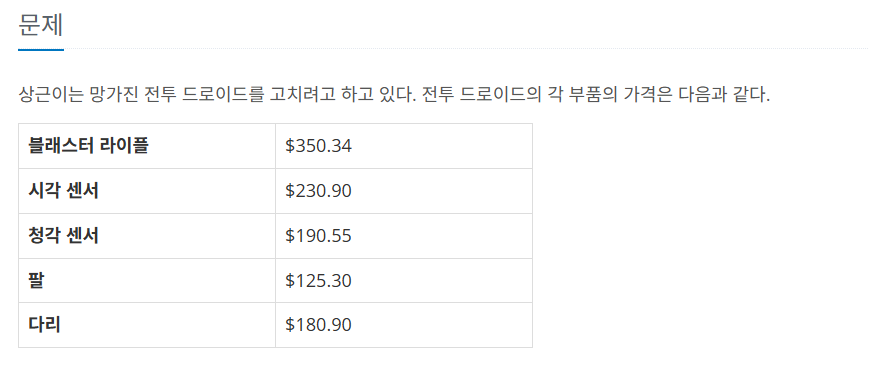 2. 각 부품들의 가격을 개수에 곱한 후 format 함수를 통해 소수점 둘째자리까지만 출력한다.