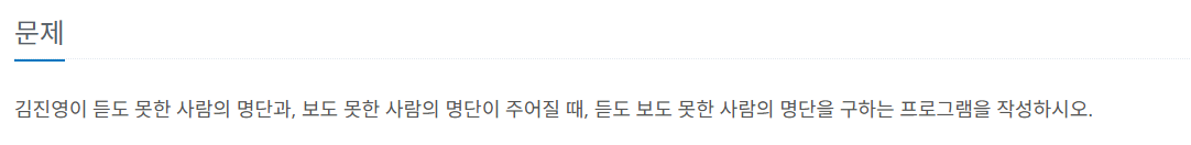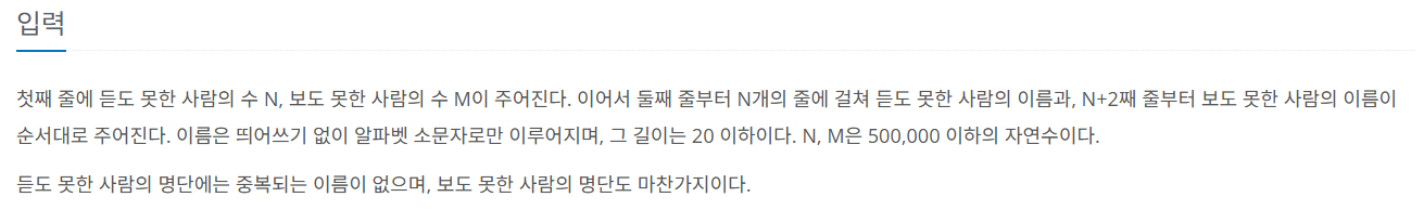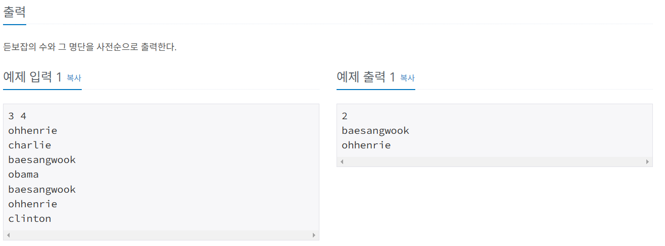 2. 듣지 못한 사람을 a, 보지 못한 사람을 b로 설정하고 각각 n과 m만큼 입력받는다.