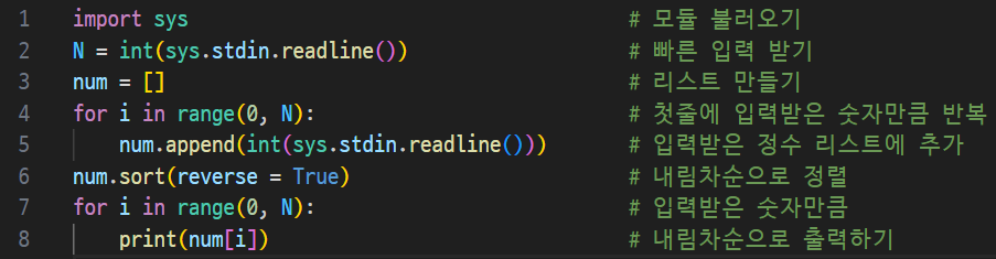 * 두번째 줄부터 입력되는 숫자를 내림차순으로 정렬해 출력해야 함