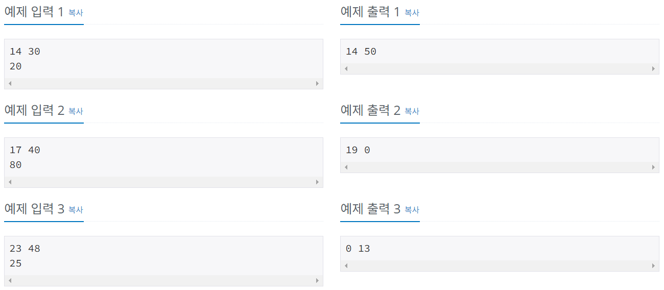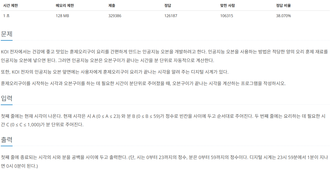 * 첫째줄에는 현재 시간(시간, 분)이, 둘째 줄에는 요리하는데 필요한 시간이 주어진다.