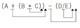 다른 예를 들어 그림으로 표현하면 A+B*C-D/E를 완전하게 괄호로 묶고 연산자를 이동시킬 장소를 표시하면 다음과 같이 된다.