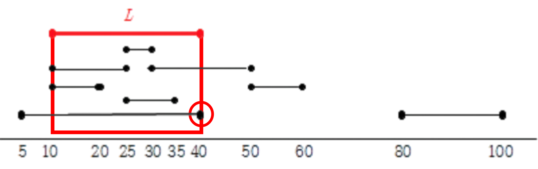 특정 길이의 구간에 들어가는 구간 수의 최대를 구하는 문제이다. end를 기준으로 정렬한 후, start을 최소 힙에 넣고 end를 통해 만든 구간에서 밖으로 나가 있는건 전부 버린 뒤 힙 내부에 남아있는 점의 수를 세면, 특정 길이의 구간 내에 들어가는 구간의 갯수를 구할 수 있다.