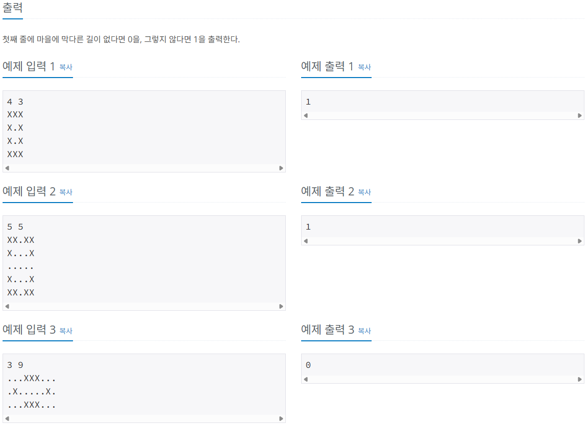 그러므로 모든칸을 조사하면서 상,하,좌,우로 움직일 수 있는 칸의 개수를 카운팅하면서 1이하인 칸이 존재한다면 해당 마을은 막다른 길이 된다.