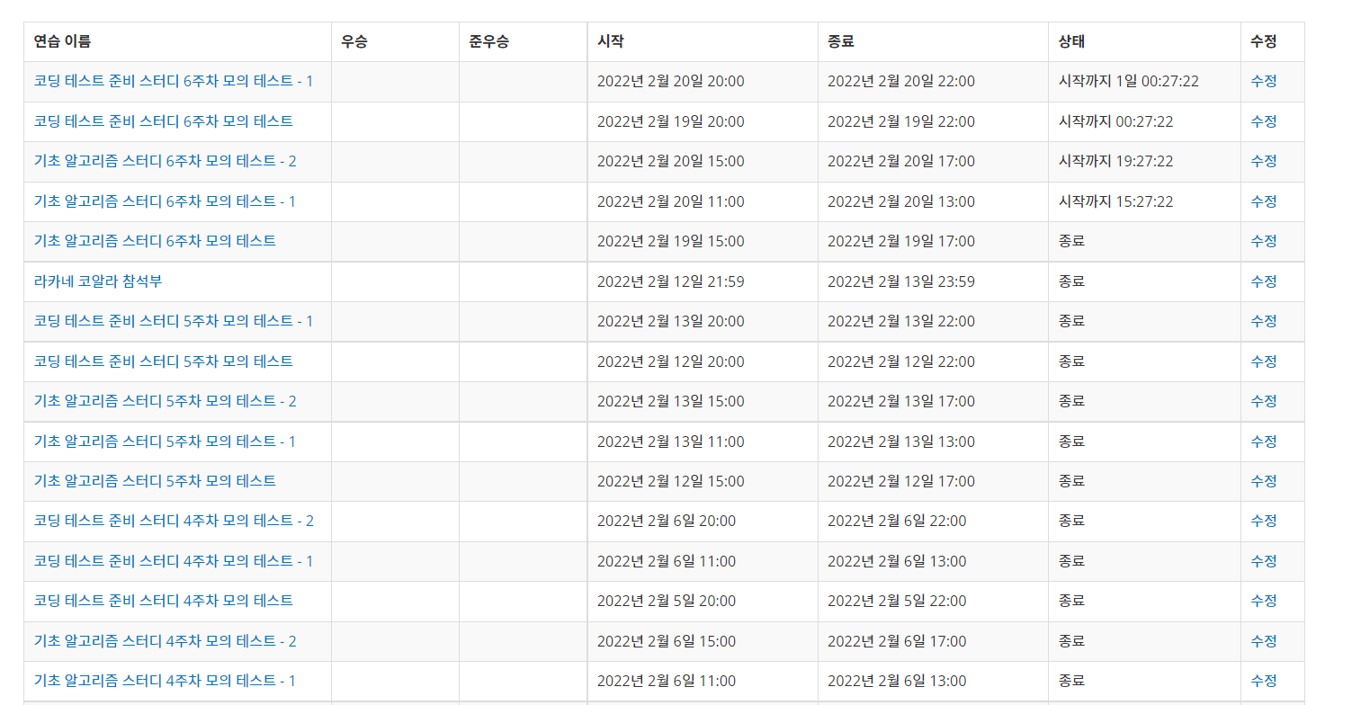 - 매 주마다 1회 시간 제한을 두고 코딩 테스트 유형에 맞는 문제들을 푸는 스터디입니다. 시간과 유형은 팀블로그 링크를 참조하시길 바랍니다.