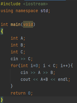 먼저 여기서 나올 수 있는 변수들은 두 수의 합을 구해야하므로 두 수(A,B) 그리고 얼마나 더하기를 반복할지 결정하는 수(C), 이렇게 3개다. 따라서 먼저 변수들을 모두 선언해준 뒤, for문을 이용하여 C만큼 반복하여 숫자를 더하는 경우를 구해줄 수 있도록 코드를 짰습니다.
