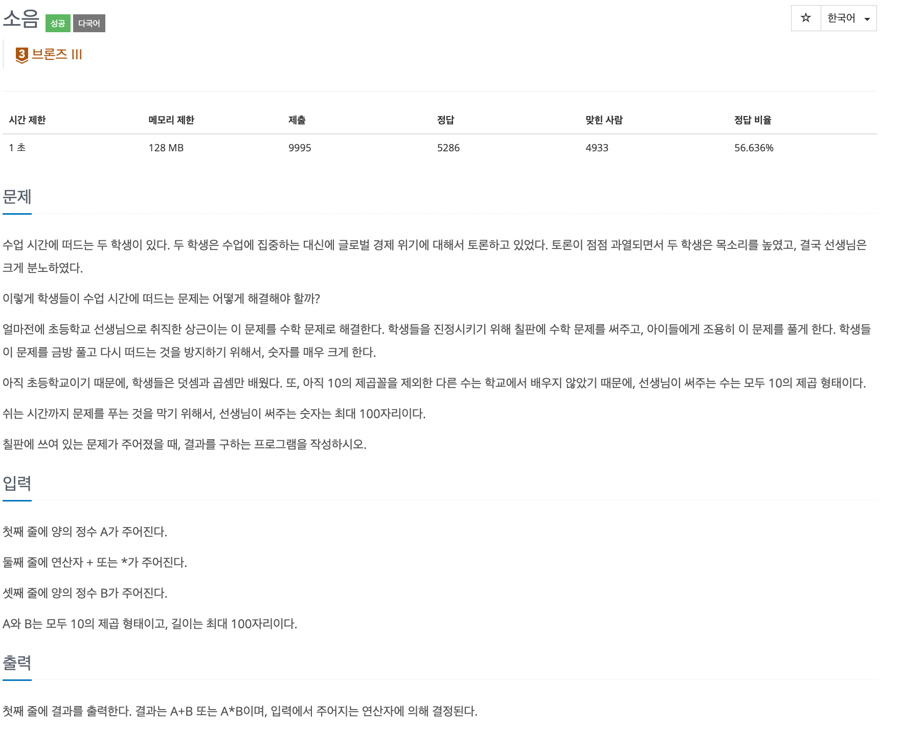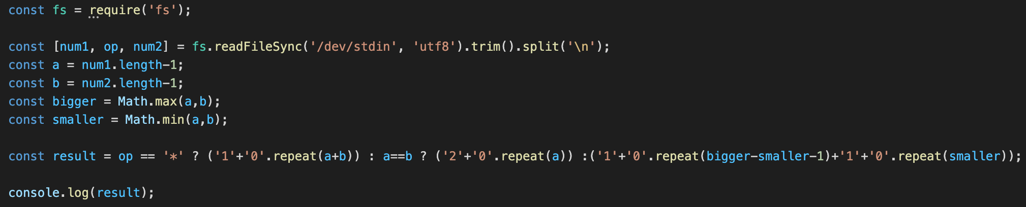 Number 타입으로 출력시 숫자 출력 형식이 달라진다. 따라서 숫자를 문자열로 변환하여 풀어야하기 때문에 0의 개수를 세고 케이스를 나누어 문자열로 덧셈 또는 곱셈 결과를 출력하였다.