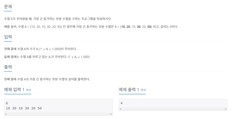 이 문제는 수열안에서, 증가하는 부분 수열 중 가장 긴 수열을 찾는 문제이다.